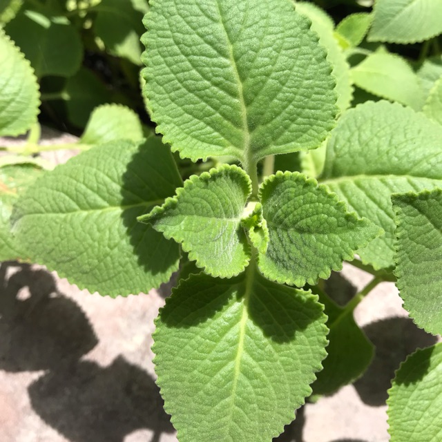 ใบเป็นใบเดี่ยว ออกตรงข้ามกัน ลักษณะของใบเป็นรูปไข่กว้างค่อนข้างกลมหรือเป็นรูปสามเหลี่ยมด้านเท่า ปลายใบกลมมน โคนใบกลมหรือตัด ส่วนขอบใบจักเป็นคลื่นมน ๆ รอบ ๆ ใบ ใบมีขนาดกว้างประมาณ 2.5-5 เซนติเมตร และยาวประมาณ 3-8 เซนติเมตร ใบเป็นสีเขียวอ่อน แผ่นใบหนาและอวบน้ำ ผิวใบมีขนอ่อนนุ่มขึ้นปกคลุมอยู่ทั่วทั้งใบ แผ่นใบนูน เส้นใบลึก ก้านใบมีความยาวประมาณ 2-4.5 เซนติเมตร ใบเมื่อนำมาขยี้ดมจะมีกลิ่นหอมฉุน