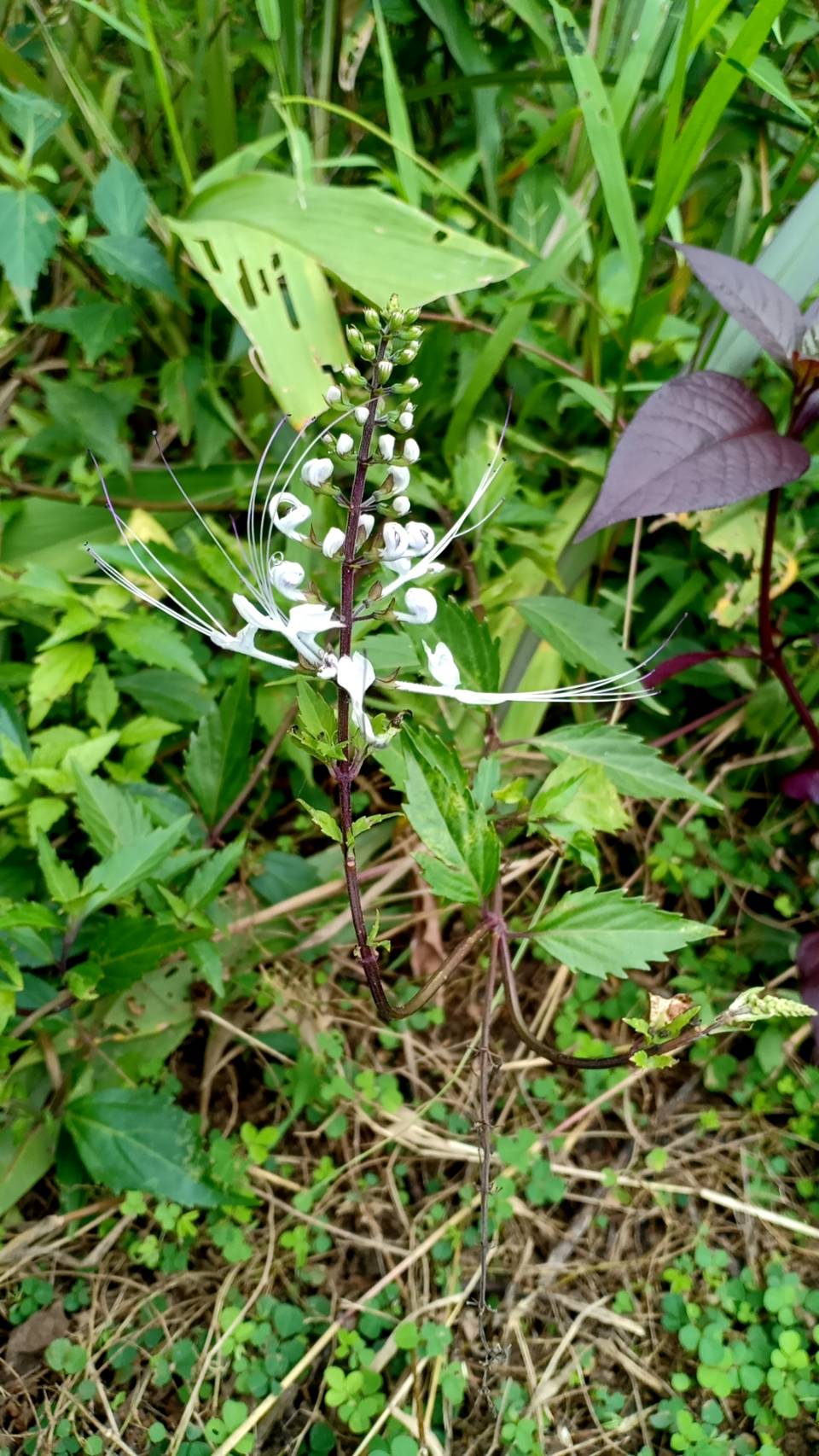 หญ้าหนวดแมวเป็นพืชล้มลุกขนาดเล็กที่มีลำต้นสูงประมาณ 30-60 เซนติเมตร ใบมีลักษณะเรียว มีขน ขอบใบเป็นรอยหยักคล้ายฟันเลื่อย มีดอกสีขาวหรือสีม่วงเป็นช่อ ตรงกลางดอกมีเกสรสีขาวยาวโผล่ออกมา