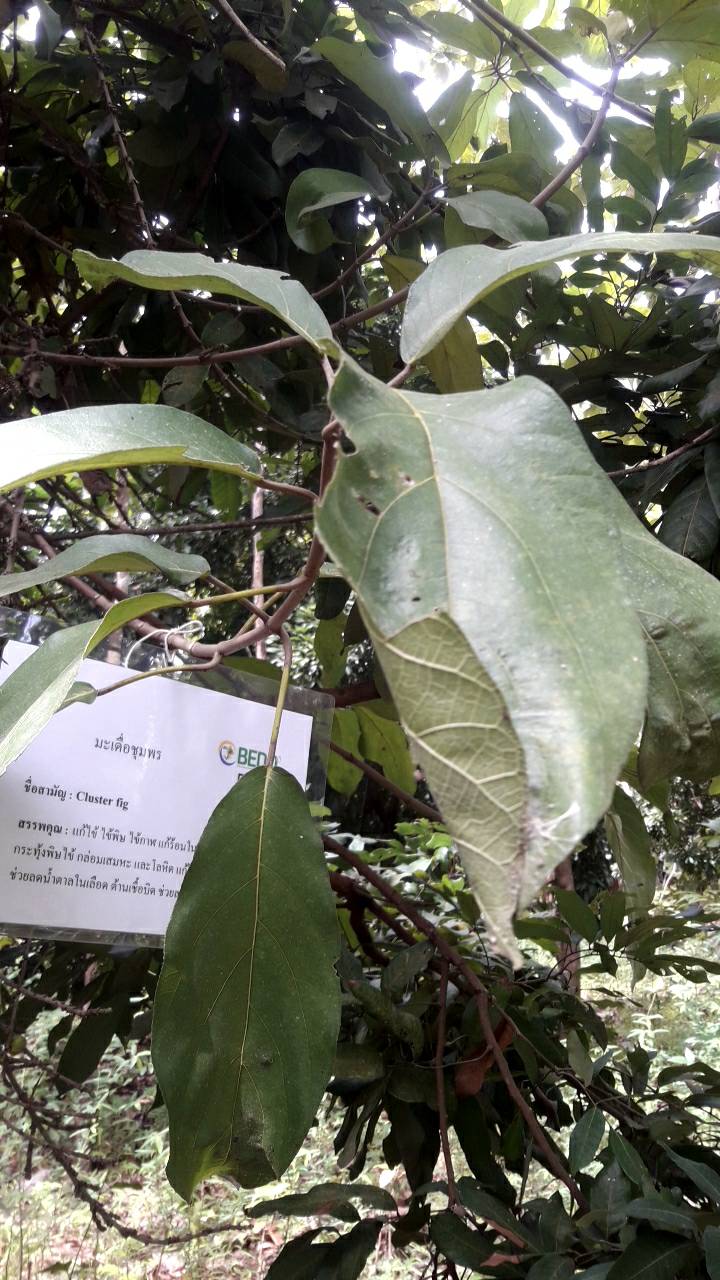 ใบ เป็นใบเดี่ยว เรียงเวียน รูปรีถึงรูปไข่กลับ รูปขอบขนานสั้น หรือรูปใบหอก กว้าง 3.5-8.5 เซนติเมตร ปลายแหลมหรือเรียวแหลม โคนสอบแคบถึงโค้งกว้าง หรือรูปหัวใจ ขอบเรียบ เนื้อหนา เส้นใบมีข้างละ 4-8 เส้น ก้านใบยาว 1.5-7 เซนติเมตร สีน้ำตาล
